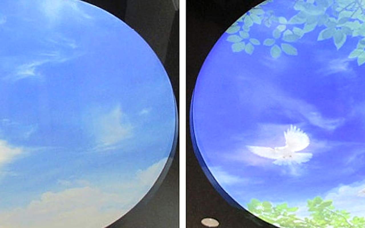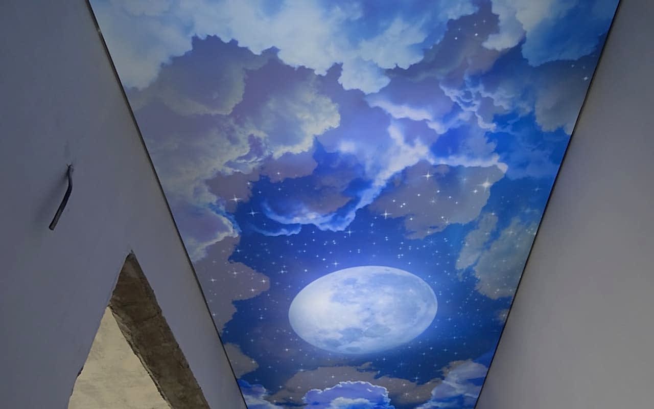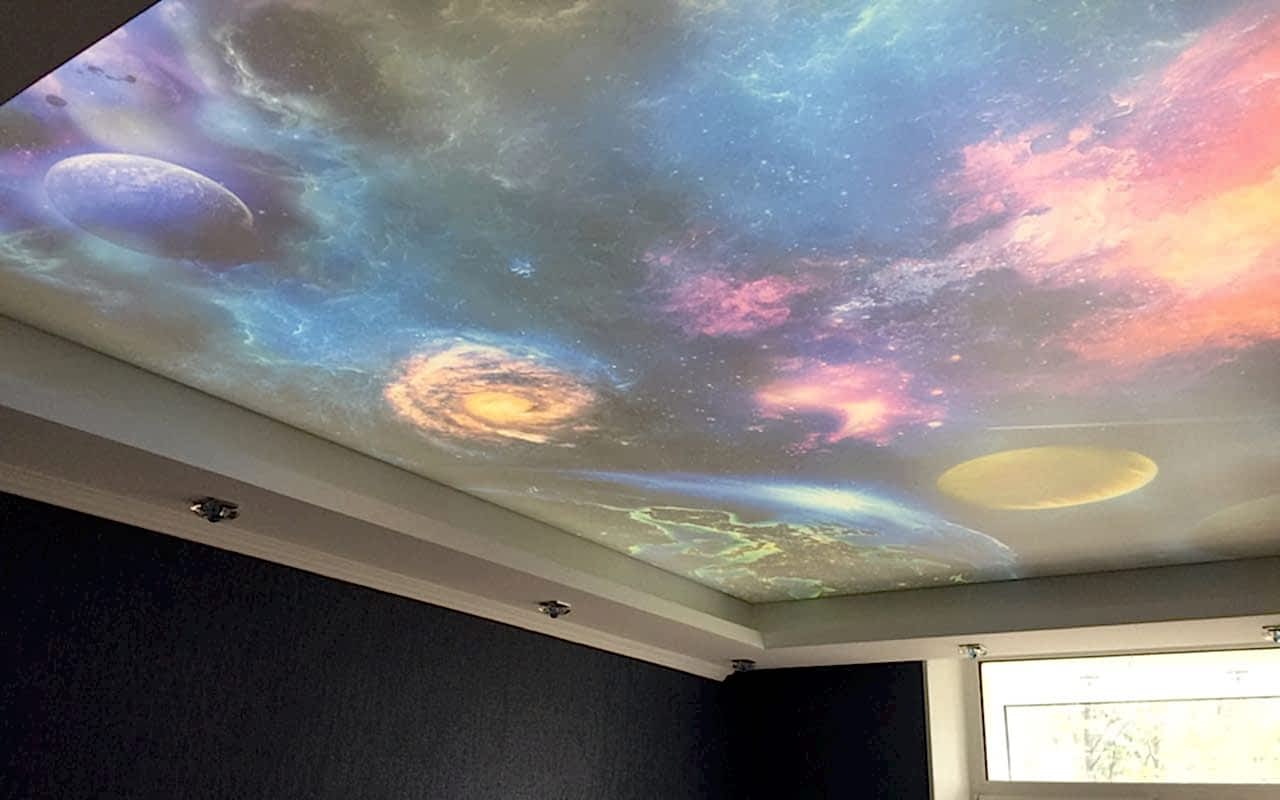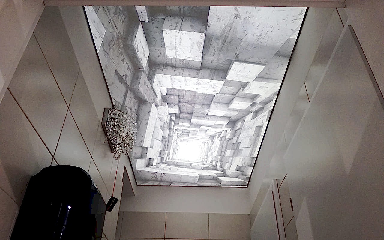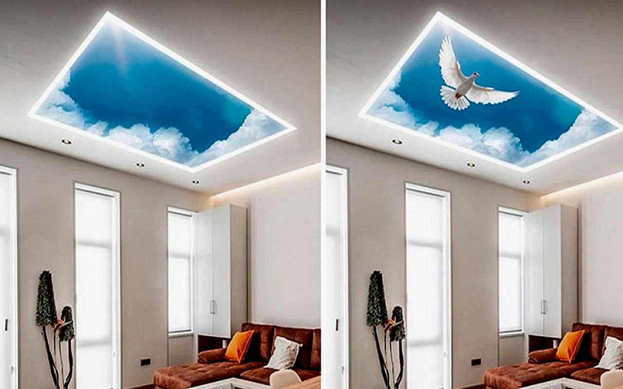 Технология натяжных потолковДабл вижн (Double Vision)похожа на стандартнуюфотопечать. С разницей лишь в том, что рисунок наносится не только на внешнюю сторону ПВХ-полотна, но и на внутреннюю. Разница лишь в том, что на внутренней стороне есть какой-то дополнительный элемент. Например, летящая по небу птица. При дневном освещении объекта не видно. Он Pin Up заметен лишь при включении искусственного освещения - спрятанной под полотном подсветки.
