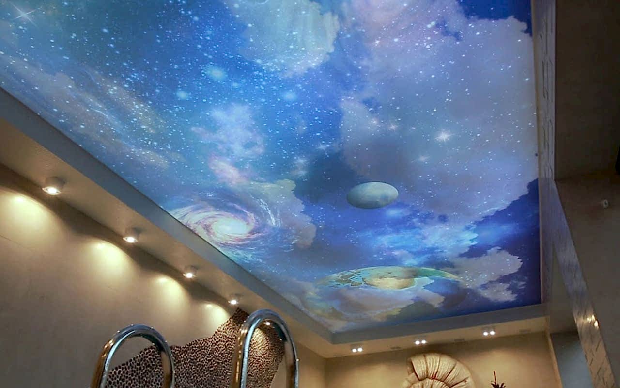 Небольшой минус в том, что печать осуществляется только на ПВХ-пленке. На тканевом полотне ее сделать нельзя. Pin Up такой потолок обойдется гораздо дороже обычной фотопечати.Pin Up со всем ассортиментом можно настранице цен.