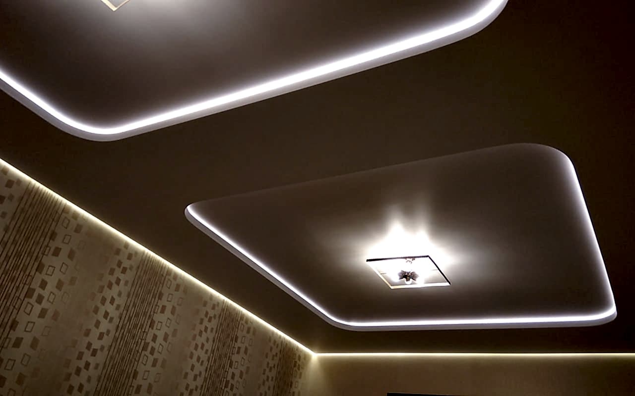 Парящие натяжные потолки- это интересное современное решение для любой комнаты. Особенность конструкции заключается в освещении потолка по периметру. Полотно закреплено в профиле, который позволяет проложить между собой и стеной Pin Up ленту. Подсвеченный «зазор» создает ощущение, будто конструкция парит. Это визуально увеличивает помещение.