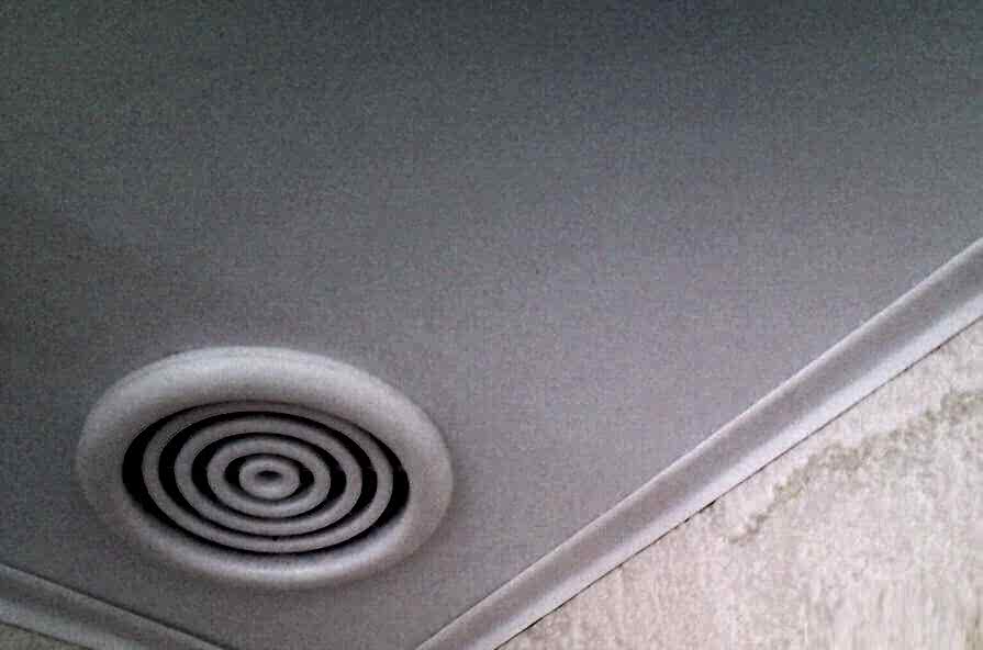Установка вентиляционных решеток в натяжной потолок. Чтобы воздух свободно проходил за плёнку, в натяжном потолке проделывают отверстия и вставляют пластиковые вентиляционные решетки. В итоге потолок не слипается и не надувается. Вентиляционные решётки устанавливают в малозаметных местах: за потолочным карнизом, над шкафом, в углу и т. п. Точное количество определить сложно, поэтому монтируют по одной, затем проверяют, сохранилась ли проблема, при необходимости добавляют ещё решётку и т. д.